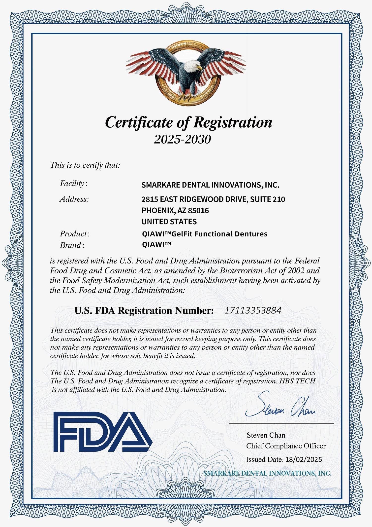Is QIAWI™GelFit Functional Dentures FDA approved or medically certified?